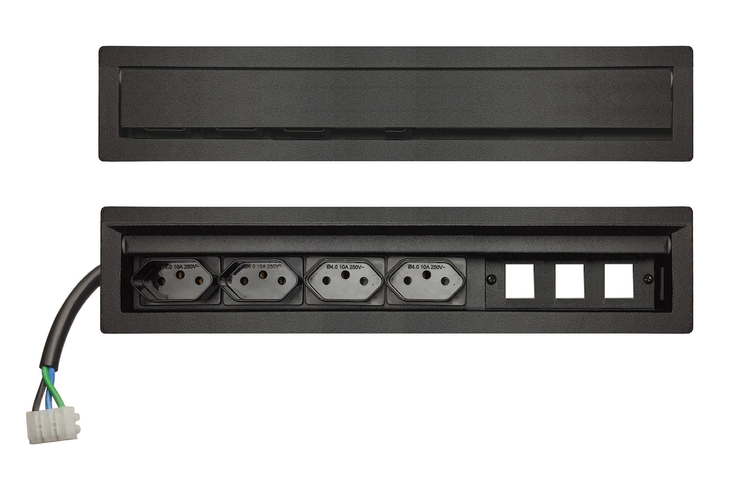 Caixa de tomada em estilo regua para embutir em mesas ou bancadas de trabalho. Possui acabamento nas cores Preto Micro texturizada, Prata e Branco.